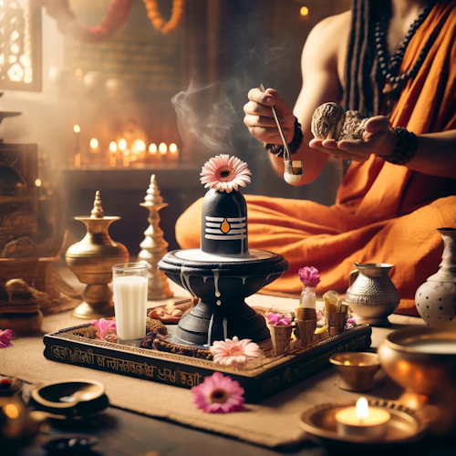 - Offerings of Bilva leaves, flowers, and incense to the Shiva Lingam