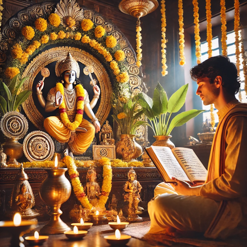 - Offering of yellow flowers, Tulsi leaves, incense, and sweets